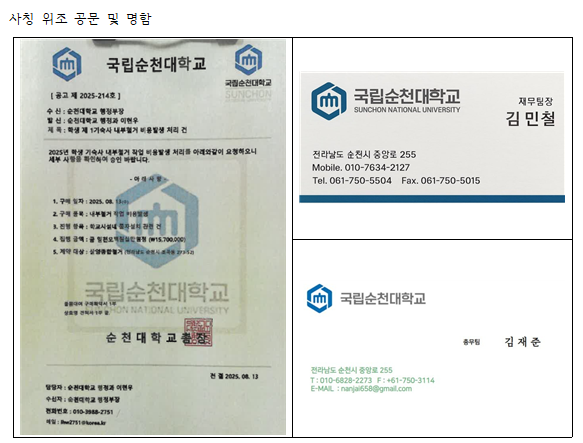 최근 관내 업체(가구점정육점, 식당 등)에 우리 대학 관계자인 것처럼 가짜 명함을 제시하여 물품을 구매하려는