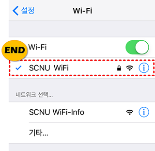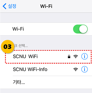 [Wi-Fi] 화면에서 [SCNU WiFi]를 선택합니다.