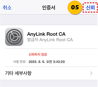 [인증서] 화면에서 [신뢰]를 선택하시면, 인터넷 연결이 완료됩니다.