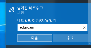 네트워크 이름(SSID) 입력란에 ‘eduroam'을 입력하고 [다음]을 클릭합니다.