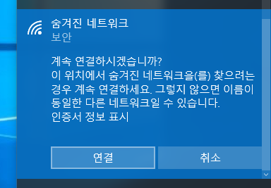 무선 네트워크 목록 중 가장 하단에 있는 [숨겨진 네트워크]를 선택합니다.