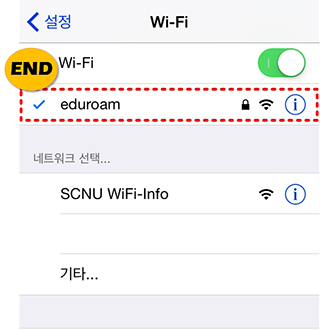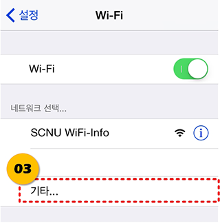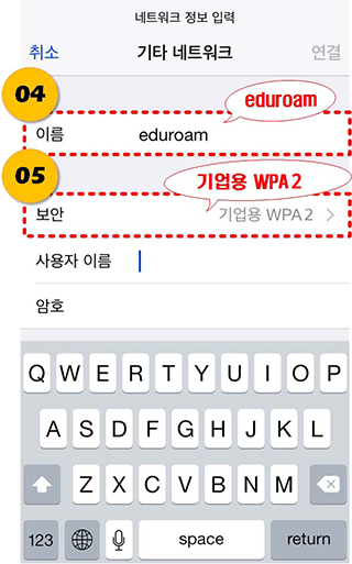 보안 화면에서 기업용 WPA 2를 선택 후 기타 네트워크를 누릅니다.