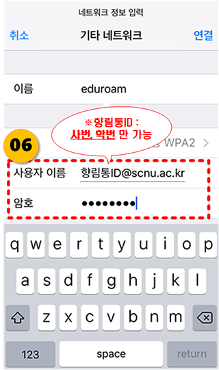 기타 네 트워크 화면에서 사용자 이름과 암호는 향림통시스템에서 사용하는 아이디(학번, 사번)와 패스워드를 입력합니다.