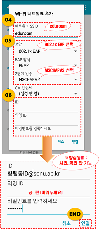 네트워크 SSID eduroam 입력 보안에서는 802.1x EAP 선택 2단계인증은 MSCHAPV2를 눌러줍니다.